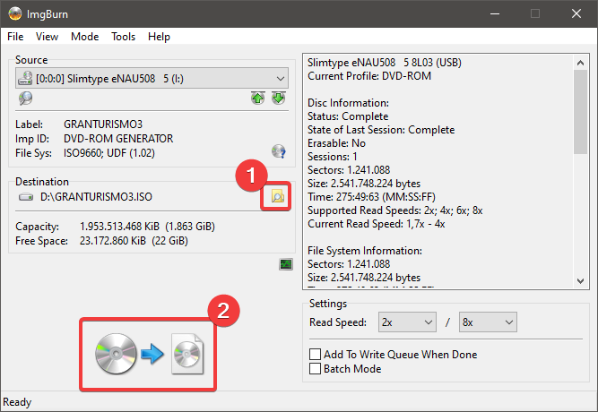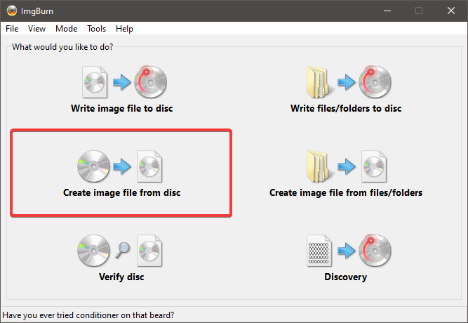 - Choose the "Create an image file from disc" option inside ImgBurn (highlighted in screenshot below)